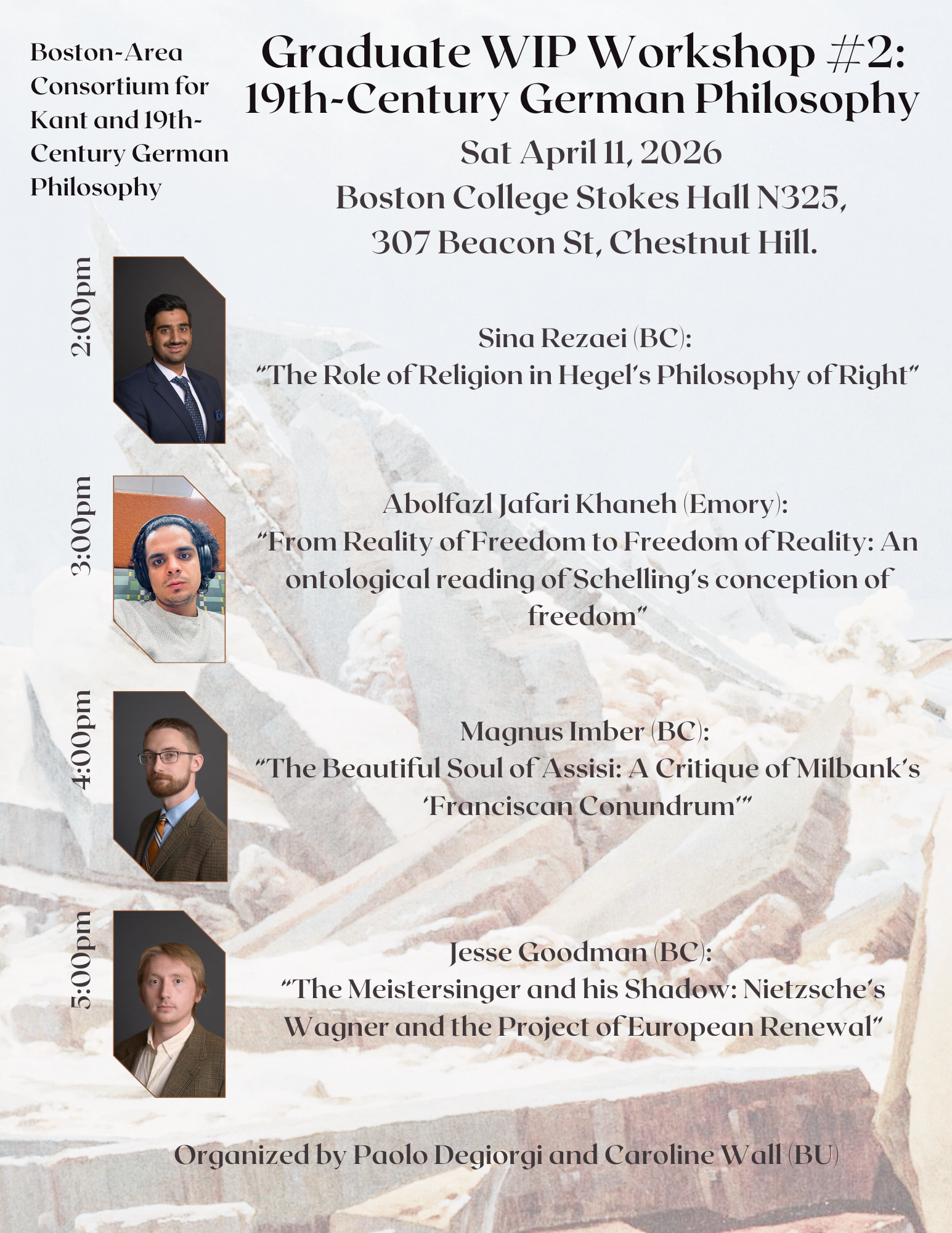 We are pleased to announce the final schedule for the upcoming graduate work in progress workshop taking place at Boston College this Saturday April 11, between 2 and 6 PM. Our topic will be 19th century German philosophy. The event – free and open to everyone – will take place at BC’s Stokes Hall N325, 307 Beacon St, Chestnut Hill. You can reach out to degiorgi@bu.edu if you wish to read any of the papers ahead of time.