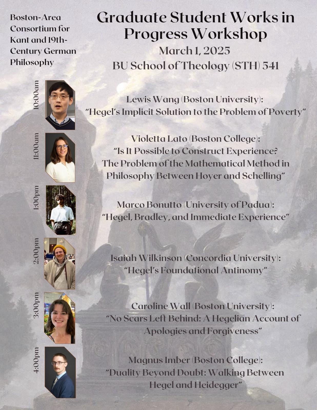 Speakers: Francey Russell (Barnard), Peter Gordon (Harvard, History), Paul Katsafanas (BU). Conor Bulkeley-Crane (Harvard, German), Caroline Wall (BU), Eli Davey (Princeton).